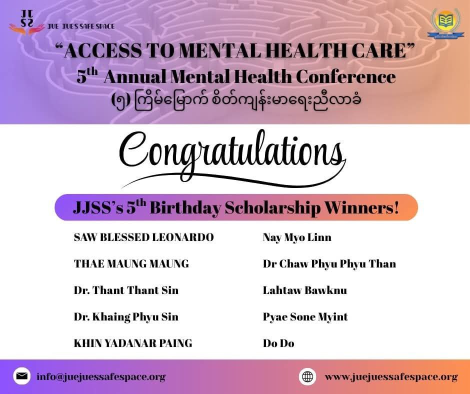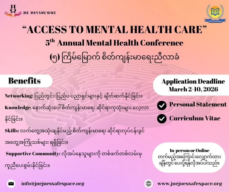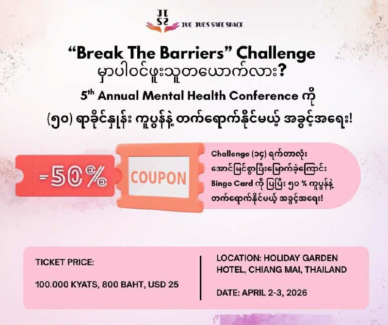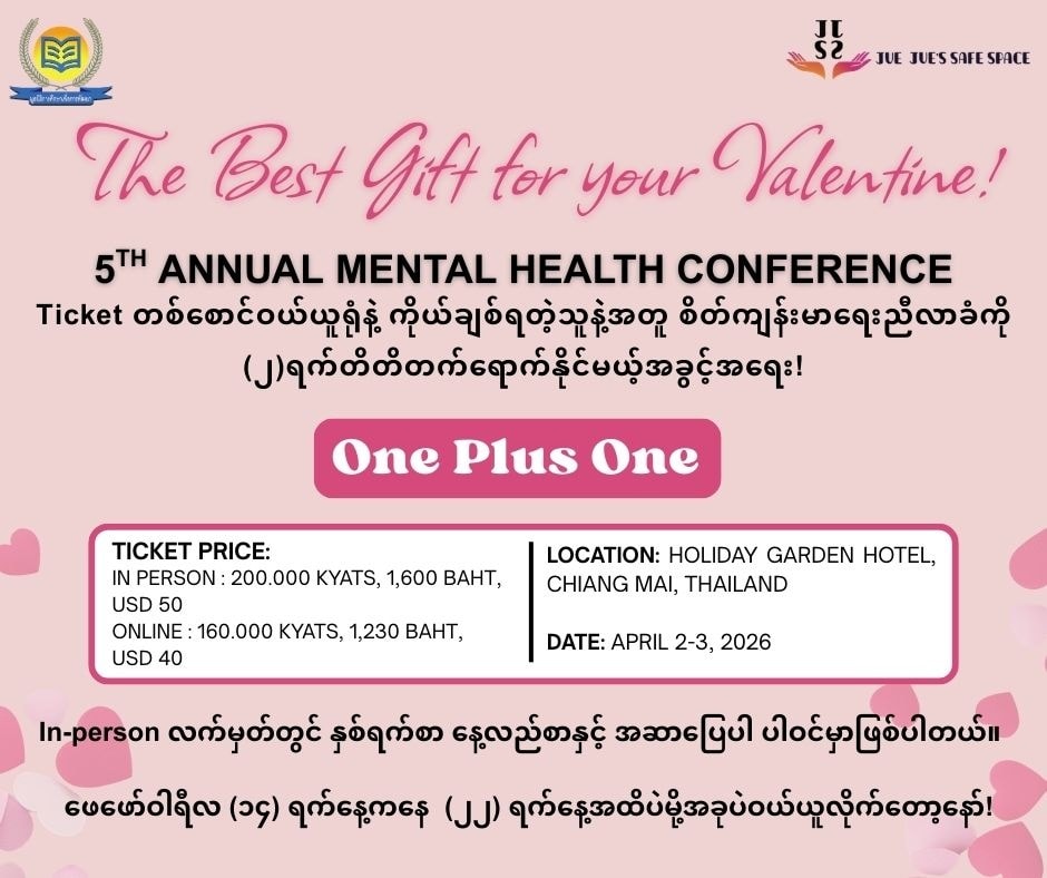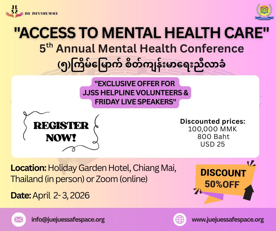 The 5th Annual Mental Health Conference will be held on April 2 and 3.As a gesture of appreciation to the guest speakers who have contributed to Jue Jue’s Safe Space Friday Live Program, and to the volunteers who have been actively supporting our Helplines, we are offering a 50% discount on the conference registration fee.Jue Jue’s Safe Space volunteers who are interested in attending can receive the 50% off discount by sending the following information through our page messenger: -Your volunteer agreement form -Volunteer name -The helpline batch you are currently participating in With the 50% discount, the registration fee for both online and in-person attendance will be only 100,000 Kyats, 800 Baht, or USD 25.All funding raised from the conference will be used, as we do every year, to support individuals and communities who are truly in need of mental health assistance through Jue Jue’s Safe Space programs.