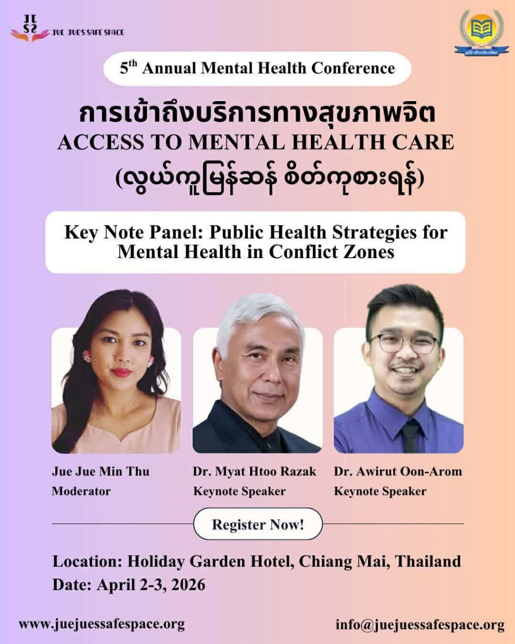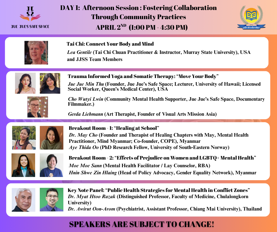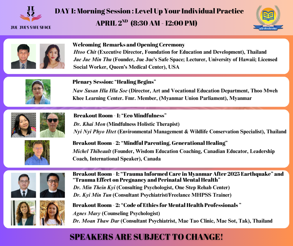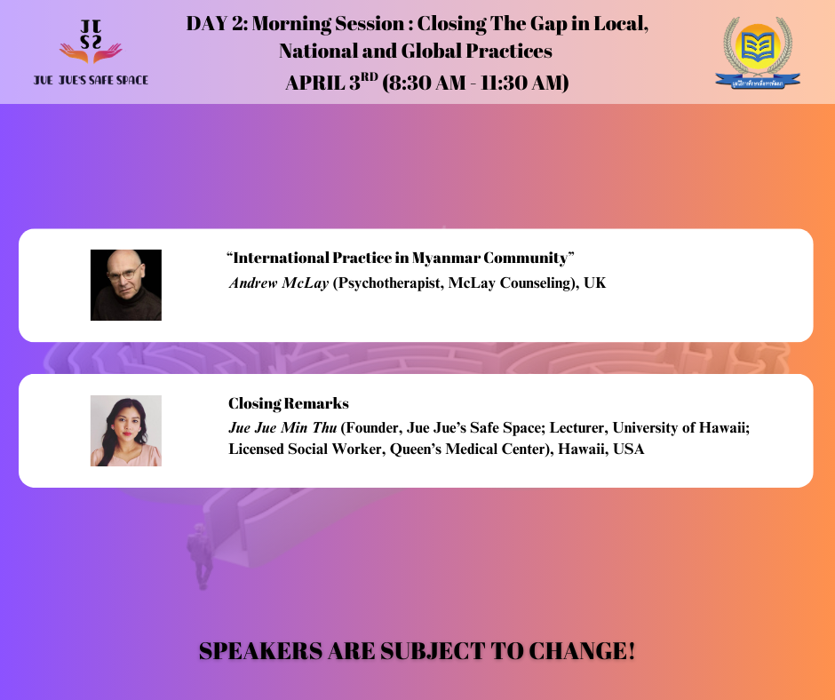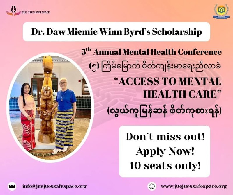 The 5th Annual Mental Health Conference will be held on April 2 and 3.As a gesture of appreciation to the guest speakers who have contributed to Jue Jue’s Safe Space Friday Live Program, and to the volunteers who have been actively supporting our Helplines, we are offering a 50% discount on the conference registration fee.Jue Jue’s Safe Space volunteers who are interested in attending can receive the 50% off discount by sending the following information through our page messenger: -Your volunteer agreement form -Volunteer name -The helpline batch you are currently participating in With the 50% discount, the registration fee for both online and in-person attendance will be only 100,000 Kyats, 800 Baht, or USD 25.All funding raised from the conference will be used, as we do every year, to support individuals and communities who are truly in need of mental health assistance through Jue Jue’s Safe Space programs.
